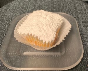 Poundcake cupcake topped with a dusting of powdered sugar.